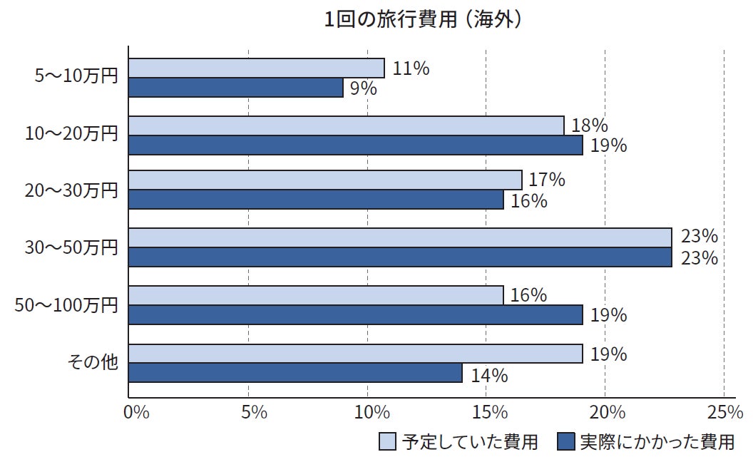 実際に旅行にかかった費用は、国内は「5〜10万円」と回答したかたが最も多く31%、海外は、「30〜50万円」が最も多く23%になりました。