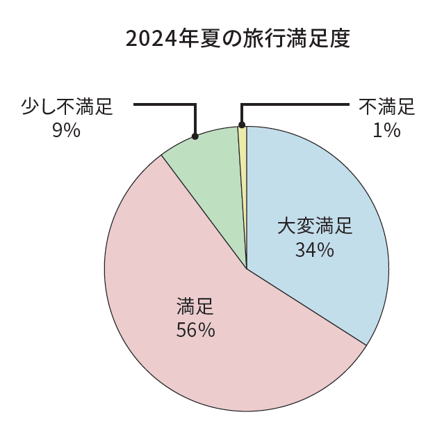 今年の夏の旅行の満足度は「大変満足」が34%、「満足」は56%と、満足以上を回答したかたは90%となりました。国内外の物価高や円安の影響を受けやすい中でも、旅行で重視するポイントを決めて楽しんだかたが多いことがうかがえます。