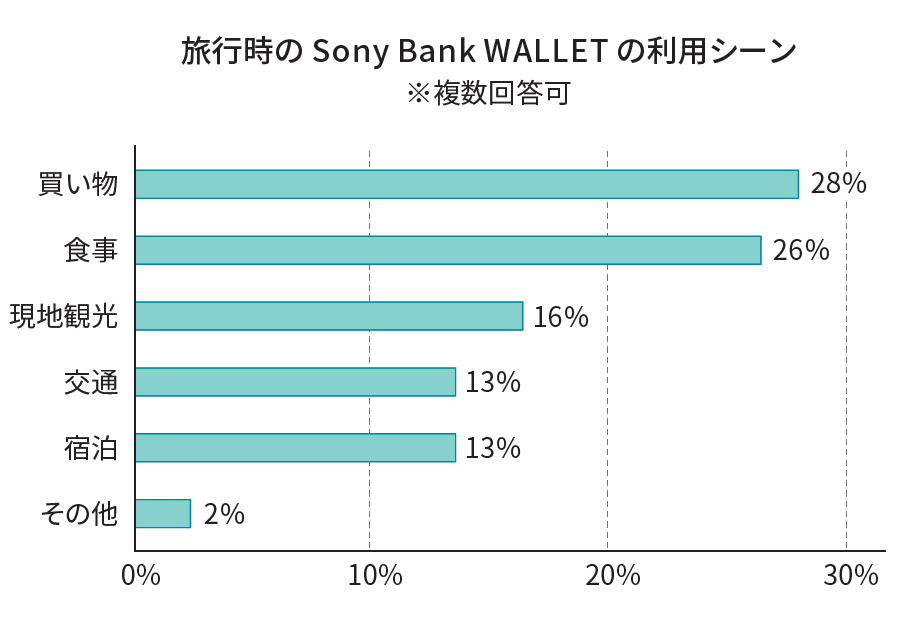 Sony Bank WALLET の利用シーンは、「買い物」が最も多く28%、次いで「食事」が26%という結果になりました。