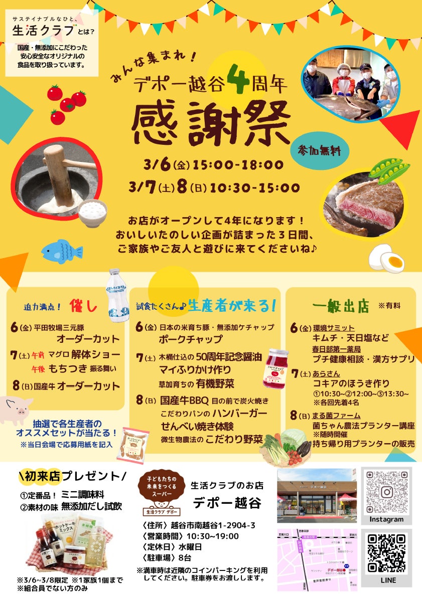 生活クラブ生活協同組合・埼玉(本部:埼玉県川口市、以下生活クラブ)は、店舗の「デポー越谷」オープン4周年を記念して、2026年3月6日(金)から3月8日(日)の3日間「デポー越谷4周年感謝祭」を開催します。