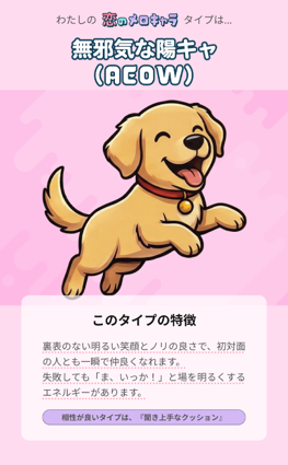 診断結果は、X(旧Twitter)をはじめとするSNSへワンタップで簡単にシェアが可能です。 16タイプそれぞれの個性豊かなキャラクターイラストがシェア画像(OGP)として表示されるため、ご自身の意外な一面を魅力的にアピールできます。 「#恋のメロキャラ16タイプ診断」のハッシュタグとともに結果を投稿することで、ご友人同士での会話のきっかけや、新しい出会いの場でのアイスブレイクとして、思わずシェアしたくなるような体験を提供します。