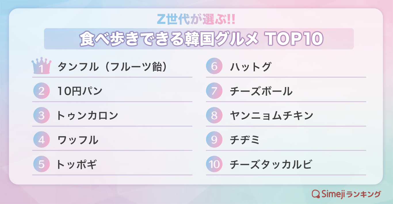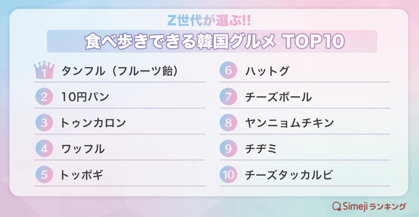 【Simejiランキング】Z世代が選ぶ!!「食べ歩きできる韓国グルメTOP10」
