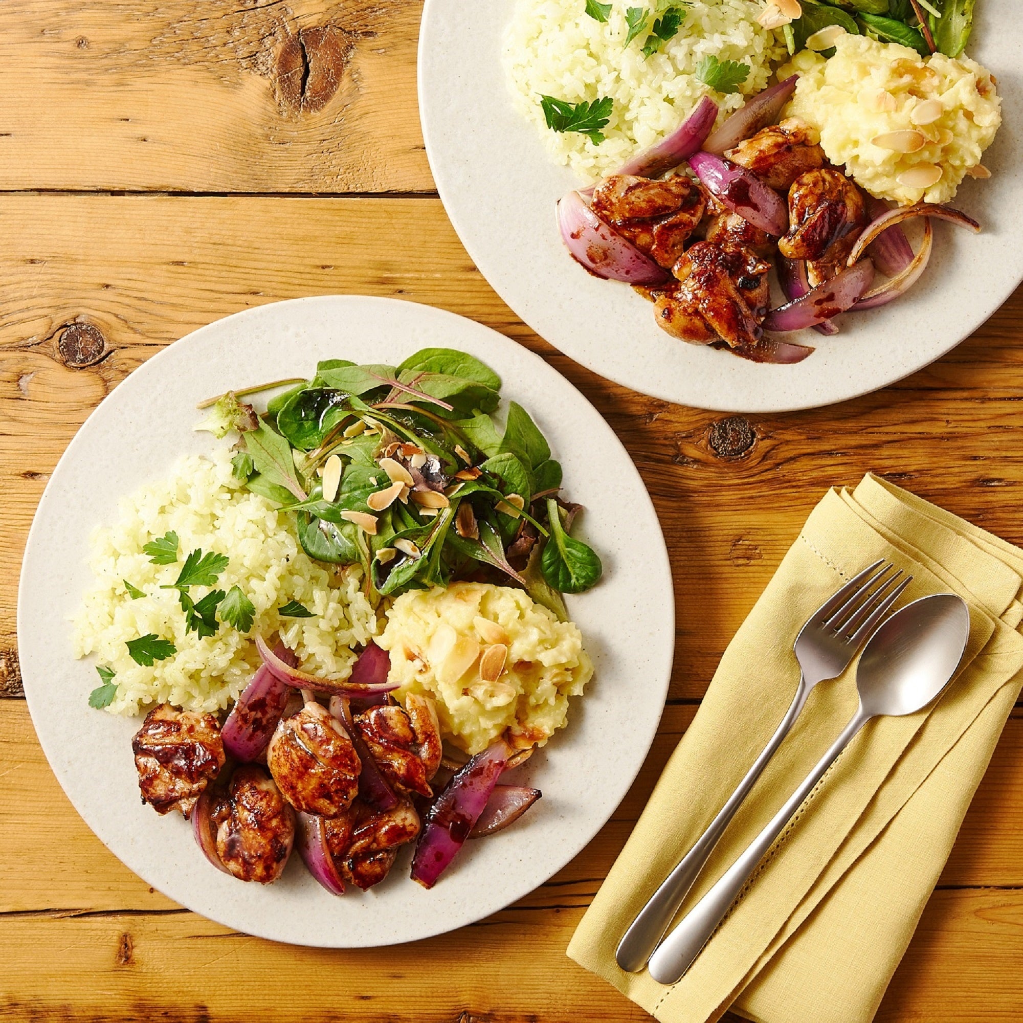 商品詳細:メインの“チキン”は、バルサミコのコクのあるソースで照り焼き風に。サイドディッシュには、アーモンドの食感とトリュフオイルの風味をふんわり加えた“マッシュポテト”を。ハーブソースとチーズを混ぜ込んだライスとフレッシュなリーフを添えて、様々な味わいが一皿で楽しめるメニューになっています。