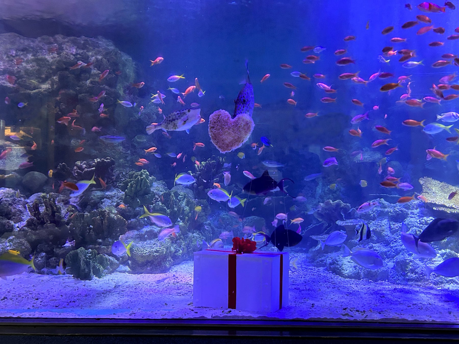 本イベントでは、水中に設置したプレゼントボックスからハート形のエサが浮かびあがり、お魚たちへプレゼントいたします。プレゼントはお魚たちが大好きなオキアミなど。普段は岩のすき間などに隠れているお魚たちがごはんを食べに現れる姿を間近でご覧いただけます。