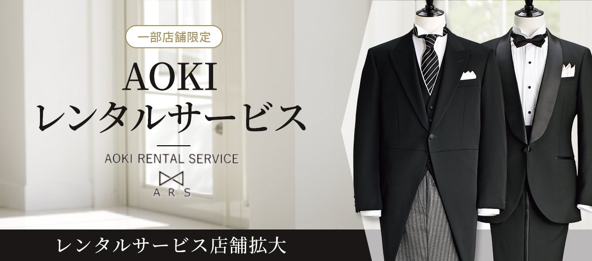 株式会社AOKI(代表取締役社長:森裕隆)は、モーニングコートやタキシードなどの礼装をお値ごろかつ気軽にレンタルできる『AOKIレンタルサービス(A・R・S)』を2021年12月に開始し、お客様からのご好評を受け、この度120店舗に拡大いたします。本サービスは店舗にてお申込みいただき、送料無料・クリーニング不要で礼装セットをレンタルできる新しいサービスです。( https://www.aoki-style.com/feature/formalrental/)