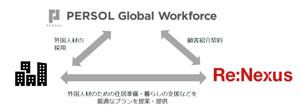総合人材サービスのパーソルグループで外国人材に特化した人材サービスを提供するPERSOL Global Workforce(パーソル グローバルワークフォース)株式会社(本社:東京都港区、代表取締役社長:多田 盛弘 以下、PERSOL Global Workforce)と株式会社リネクサス(Re:Nexus)(所在地:東京都練馬区、代表取締役:福澤 貴司、以下リネクサス)は、顧客紹介契約 を締結ししたことをお知らせします。今後、PERSOL Global workforceを通じて、外国人材を採用する事業者(顧客)に、リネクサスが外国人材の住まい(社宅)および暮らしの支援を提供するなどの協業を通じて、外国人材の「暮らし」に関するさまざまな課題の解決に貢献してまいります。