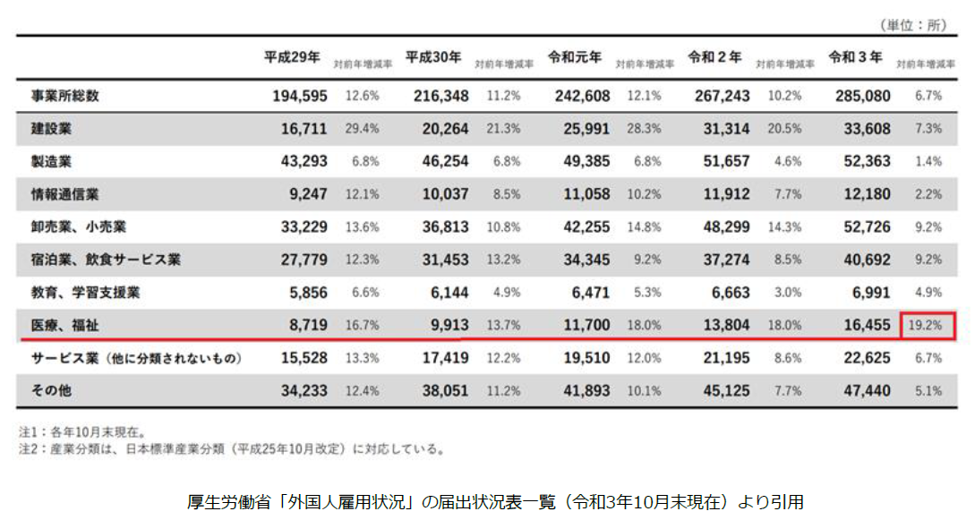 厚生労働省が発表した「外国人雇用状況」の届出状況表一覧によると、令和3年外国人労働者数のうち、医療、福祉事業の増減率は対前年比19.2%と、外国人材の需要が著しく高いことがうかがえます。