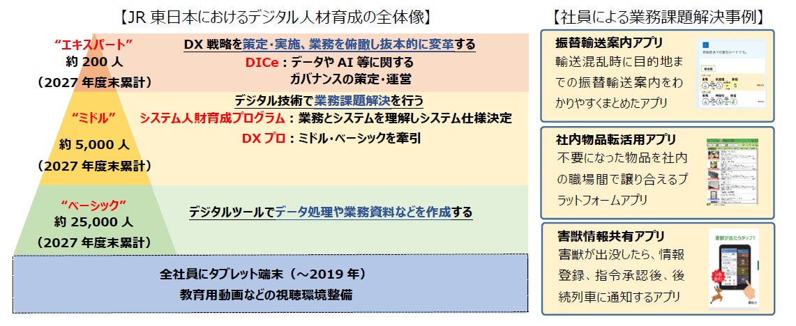 〇JR東日本は、グループ経営ビジョン「変革2027」において、技術と情報を中心にネットワークの力を強化することとしており、その一環として、全社員がタブレット端末を持つなど、全ての社員がデジタルを活用した業務変革(Digital Transformation=DX)が可能な環境を整備しています。 〇今後、鉄道事業の変革や生活ソリューションビジネスの成長に向け、DXの一層の推進が不可欠なことから、DXリテラシーを牽引する専任担当である「DXプロ」の新規配置や、「システム人財育成プログラム」のグループ全体への拡大、さらに「Digital&Dataイノベーションセンター(以下、DICe)」におけるデータの利活用やシステム開発などを進め、多様なデジタル人材を育成することにより、グループ全体のDXを加速していきます。 |