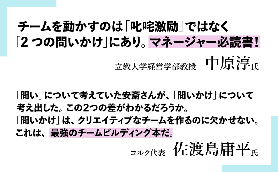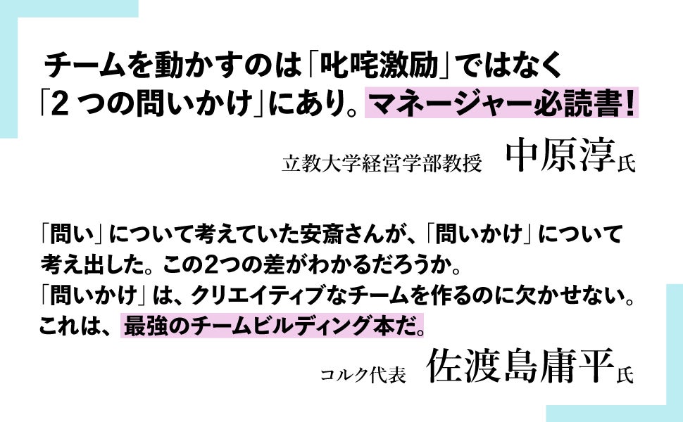 また、本書の刊行にあたり、立教大学経営学部教授の中原淳氏とコルク代表の佐渡島庸平氏に推薦の言葉をいただきました。