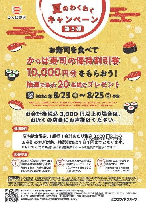・内 容:期間中に店内飲食にて 3,000 円(税込)以上ご利用いただいたお客様を対象に、抽選で最大20名様にかっぱ寿司全店舗で使える優待割引券10,000円分をプレゼントいたします。
