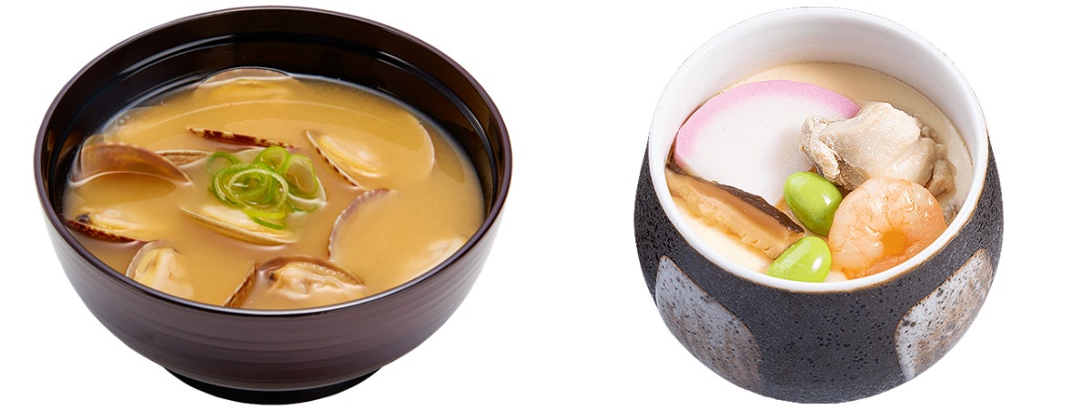 寿司と合わせてお召し上がりいただきたい “あさりのみそ汁”と人気サイドメニューのひとつ“茶碗蒸し”の二皿をセットにしました。