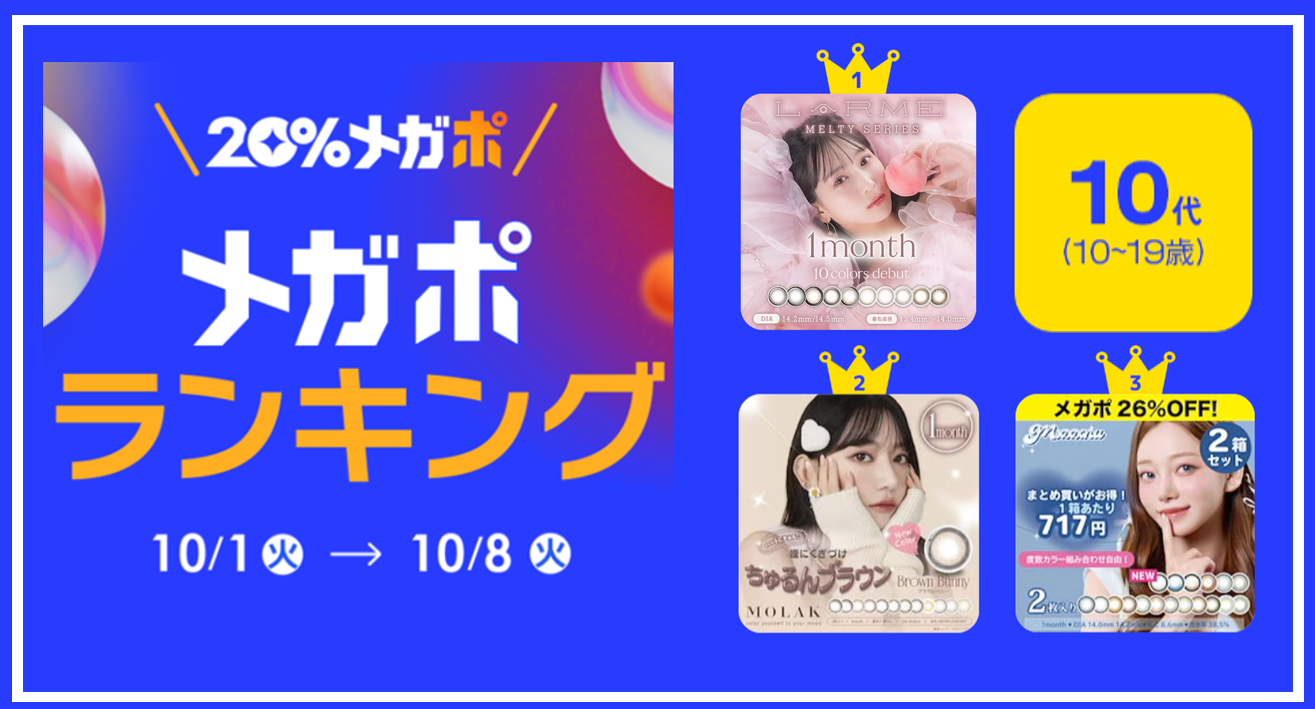 10代では、前回開催に引き続き、1位がカラーコンタクトでした。上位10位中8つの商品をカラーコンタクトが占め、圧倒的な人気を集めています。4位には、肌トーンに合わせて色が選べるフェイスパウダーがランクインしました。