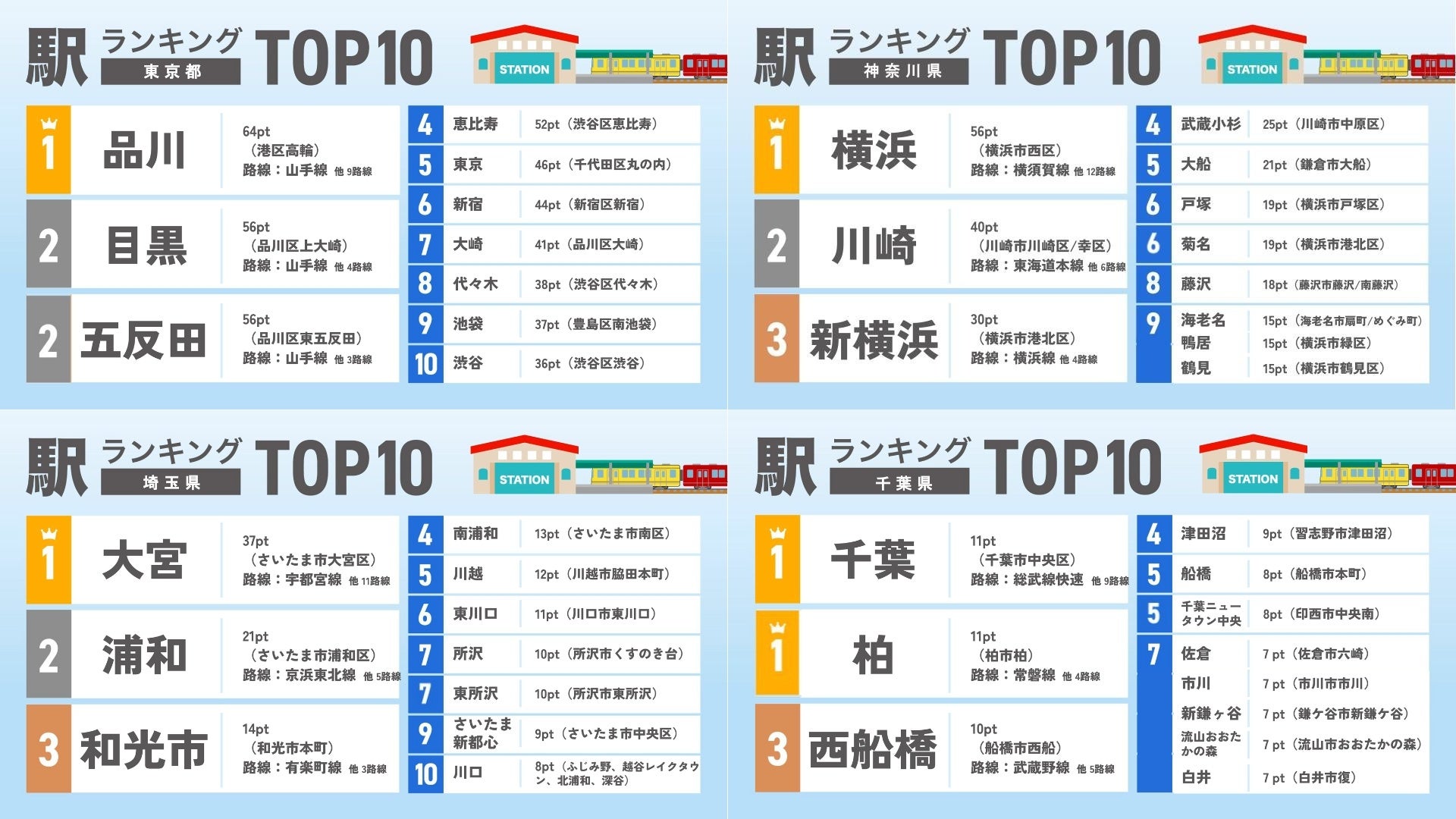 ・駅ランキング総合1位は「品川」(東京都:品川、神奈川県:横浜、埼玉県:大宮、千葉県:千葉)