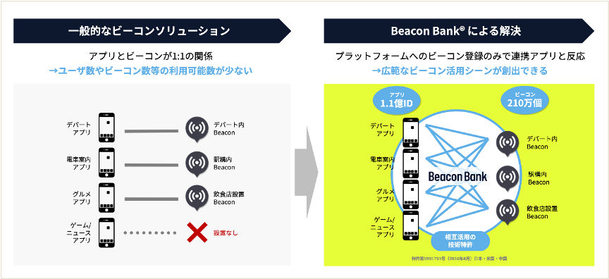 オンラインサイネージ「PISTA」にはビーコン(*1)が搭載され、それらはBeacon Bankに順次登録されることにより、対象アプリと反応することができるようになります。