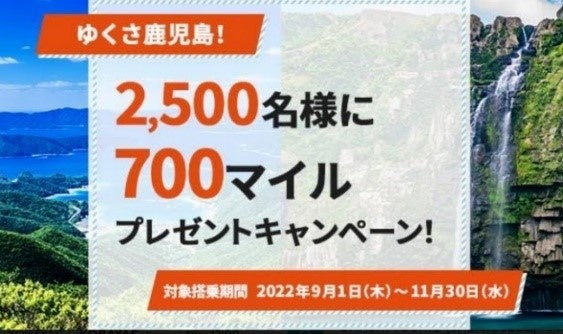 事前にアンケートに回答いただき、キャンペーンに参加登録のうえ、対象期間中、対象運賃にて、鹿児島県内各空港発着の対象路線にご搭乗いただいた鹿児島県外在住のJALマイレージバンク日本地区会員のお客さまの中から、抽選で2,500名様に700マイルをプレゼントするキャンペーンを実施しています。対象運賃などの詳細は以下URLをご覧ください。
