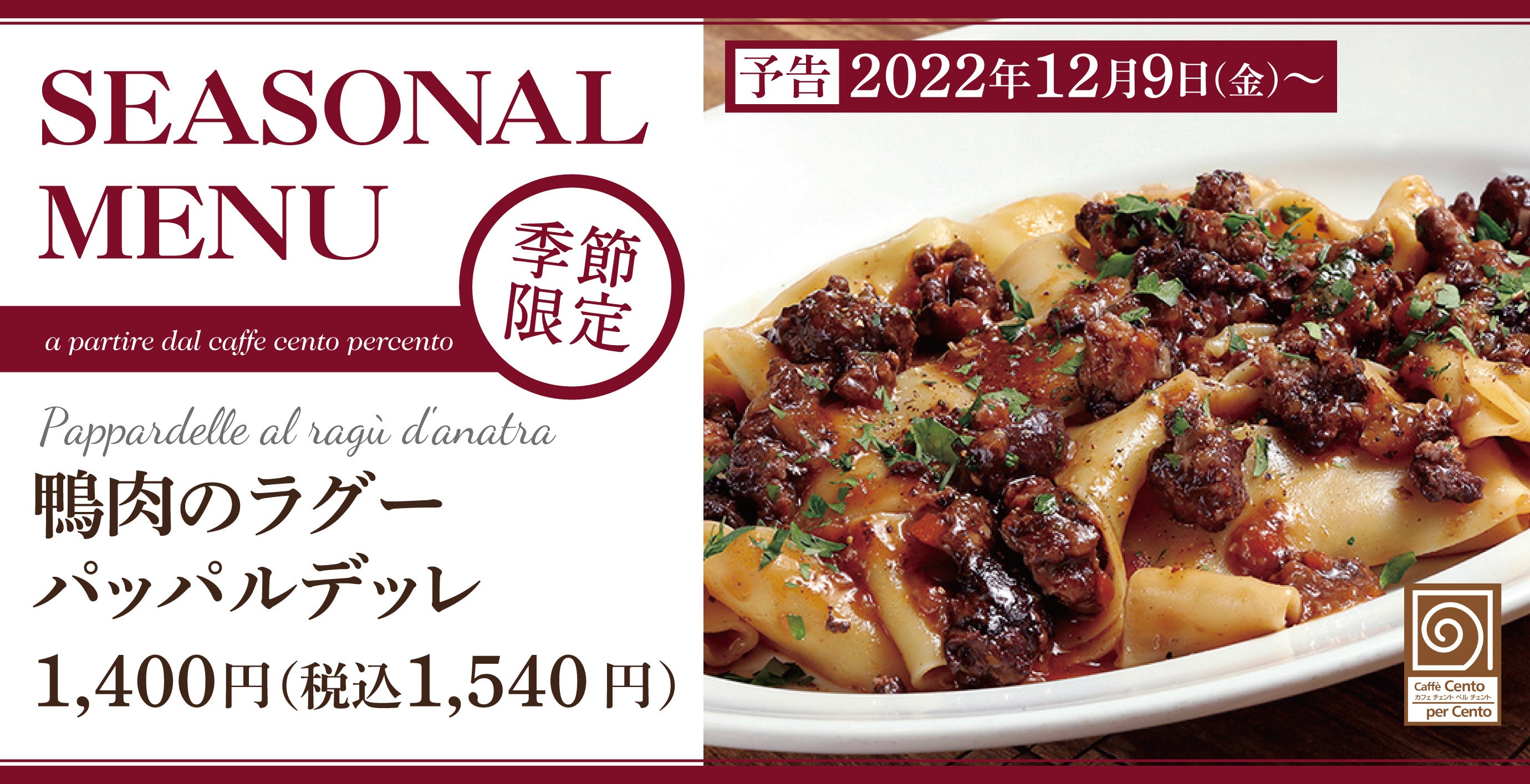 とんかつ専門店「かつや」などを展開するアークランドサービスホールディングス株式会社の子会社、フィルドテーブル株式会社(本社:東京都千代田区/代表:中島 宗則)は、ホームセンターを中心に出店し本格イタリアンを楽しめるカジュアルレストラン「チェントペルチェント」にて、2022年12月9日(金)より季節限定メニュー「鴨肉のラグー パッパルデッレ」と「イタリア風濃厚チョコレートプリンボネ」ご予約限定メニューとして、集いの食卓を華やかにする「パーティオードブル」、三郷店限定の「クリスマスコース」を販売開始いたします。
