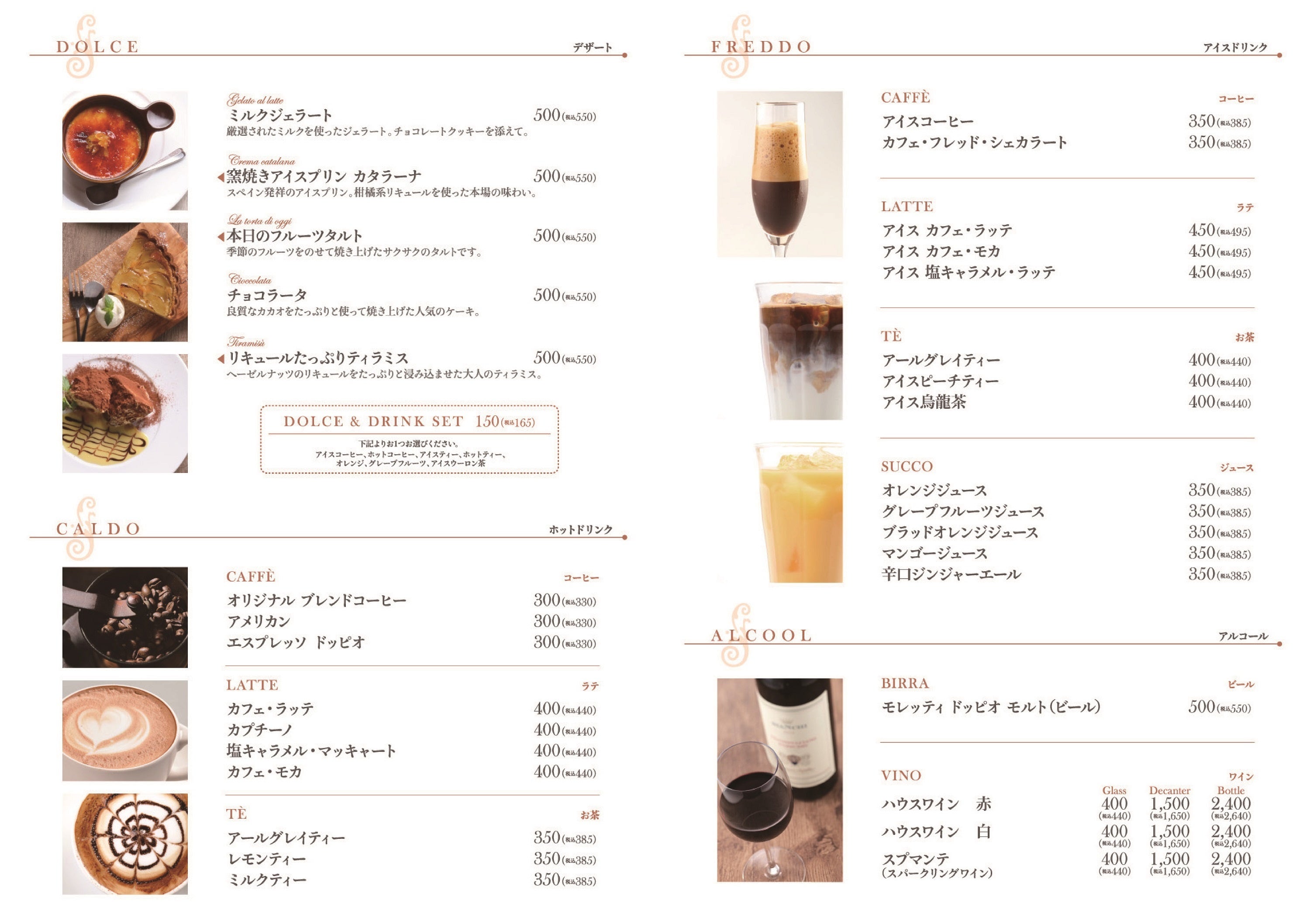 本日の前菜3種、ポルチーニ茸のポタージュ カプチーノ仕立て、鴨肉のラグー パッパルデッレ、エゾ鹿のロティ トリュフとマルサラ酒のソース、ドルチェ2種盛り合わせ、セレクトドリンクより1品