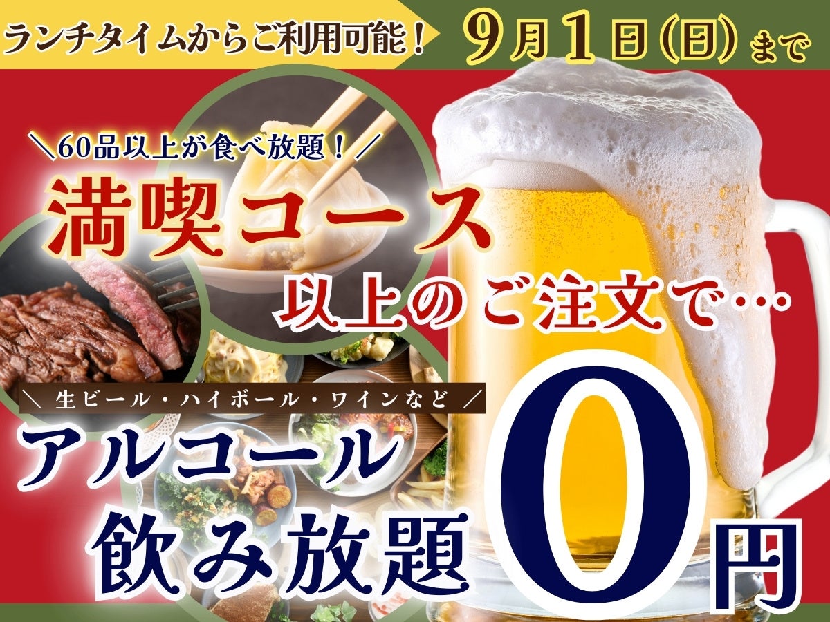 【9/1迄の特別企画!!ランチタイムからお得に食べ飲み放題!!】‟ニラックスブッフェ”のフェアグルメ満喫コース以上のご注文で『生ビール・ハイボール』などのアルコール飲み放題825円がなんと無料!!
