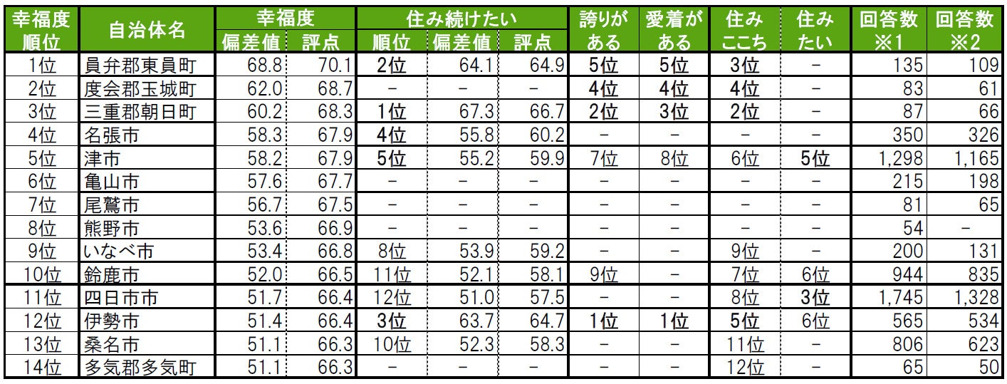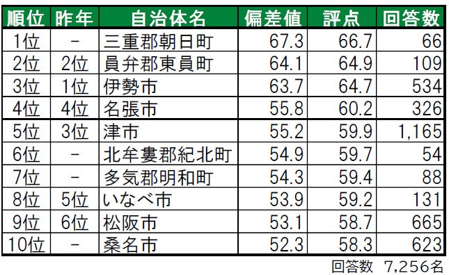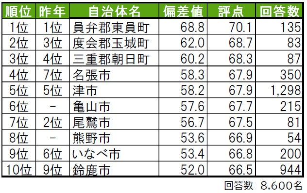 1位の三重郡朝日町は、昨年は回答数が50名未満だったためランキング集計対象外だった町で、「住みここち」「街に誇りがある」2位、「街の幸福度」「街に愛着がある」3位と高評価です。2位は2年連続で員弁郡東員町で、「街の幸福度」1位、「住みここち」3位、「街に誇りがある」「街に愛着がある」5位です。3位は伊勢市で、「街に誇りがある」「街に愛着がある」で1位です。