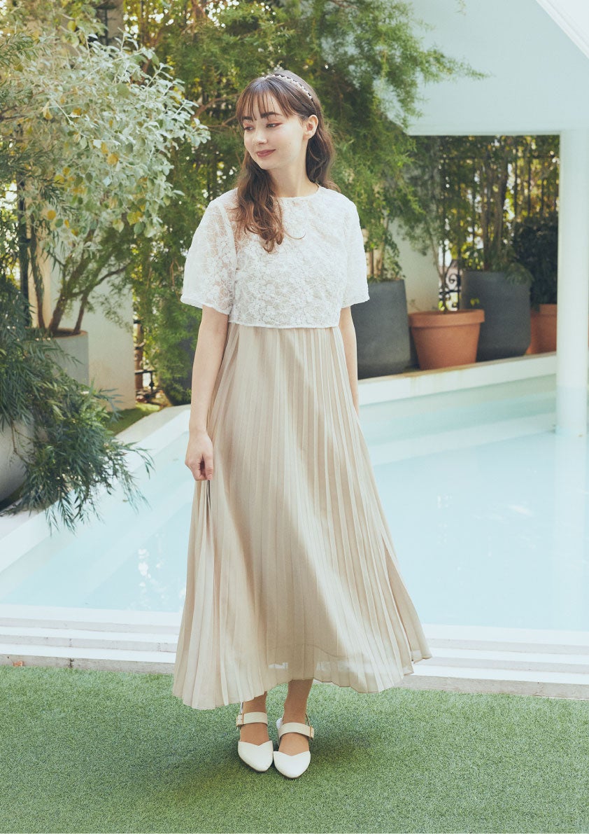 レースプルオーバーとプリーツキャミワンピースのセット。