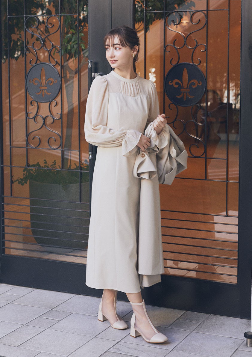 デコルテとスリーブがシアーレースになっていて華奢見えする印象に!