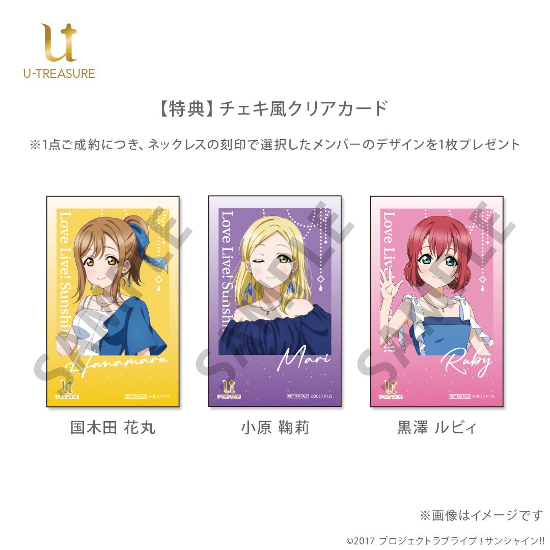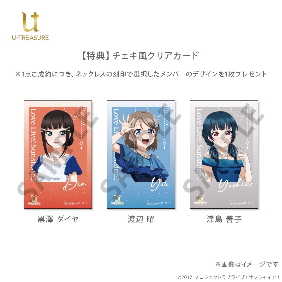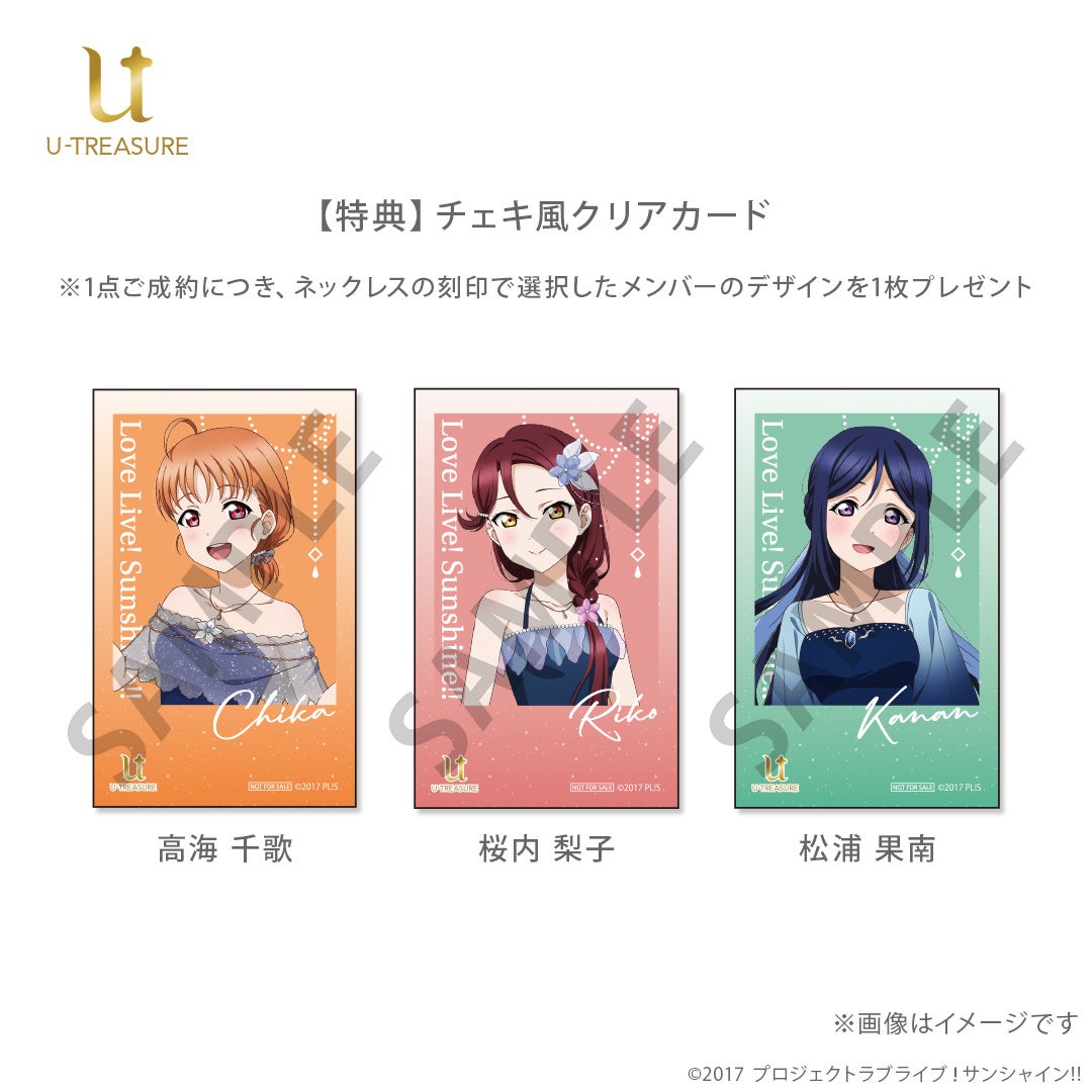 「ラブライブ!サンシャイン!! アニバーサリーネックレス」が首元に輝く、特別な衣装の描き下ろしイラストを使用した『チェキ風クリアカード(非売品)』をネックレスを1点ご成約につき1点プレゼントいたします。(ネックレスの刻印で選択したメンバーのデザインになります)
