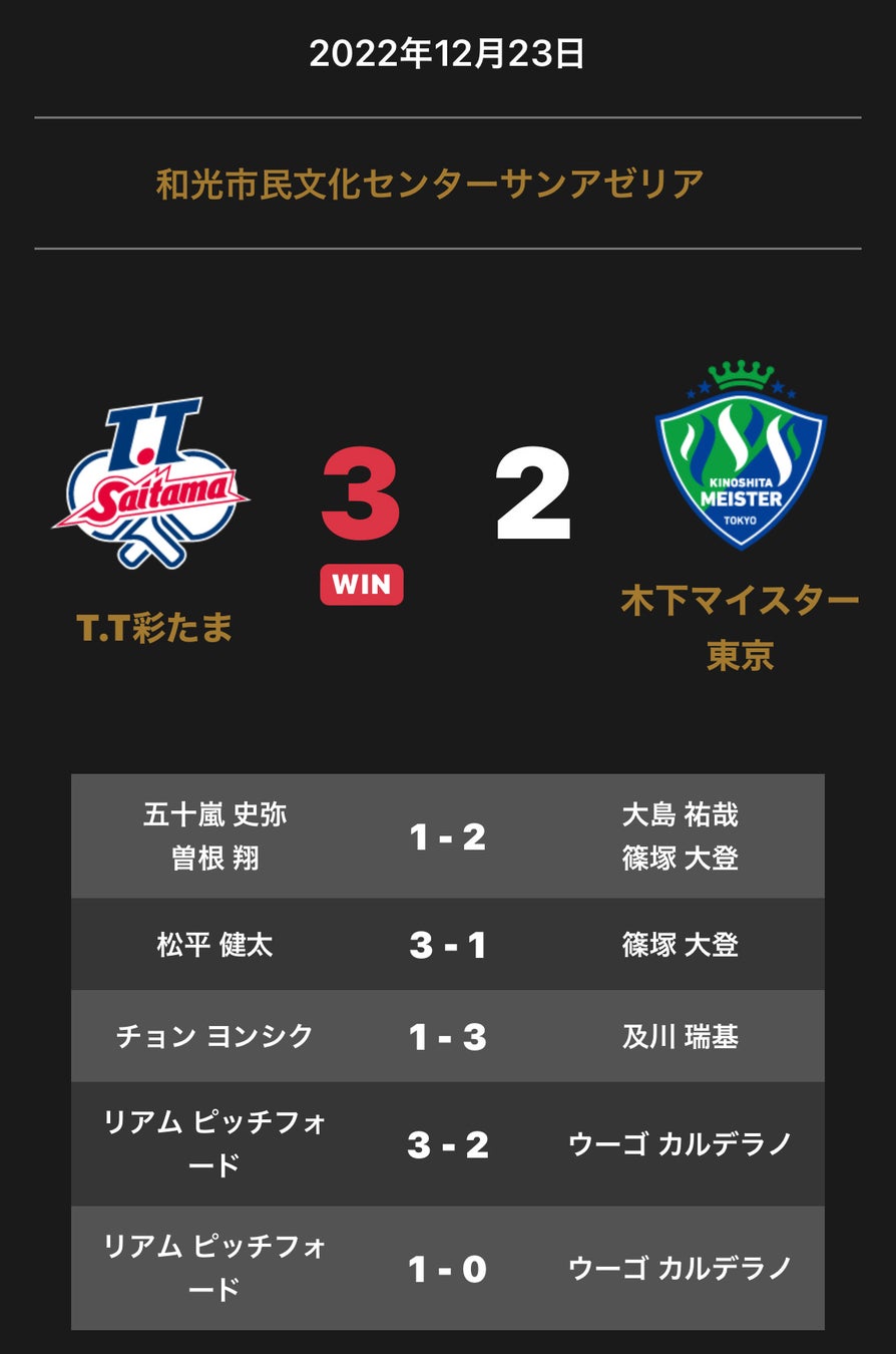 ノジマTリーグ 2022-2023シーズン 公式戦 12月23日開催 T.T彩たま vs 木下マイスター東京 試合結果