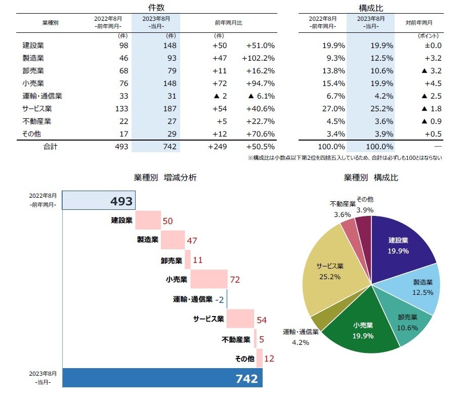 - 業種別にみると、7業種中6業種で前年同月を上回った。『サービス業』(前年同月133件→187件、40.6%増)が、2カ月連続で前年同月から40%を超える大幅増となった。「飲食店」は2023年1-8月累計で497件となり、すでに2022年通年(452件)を超えた