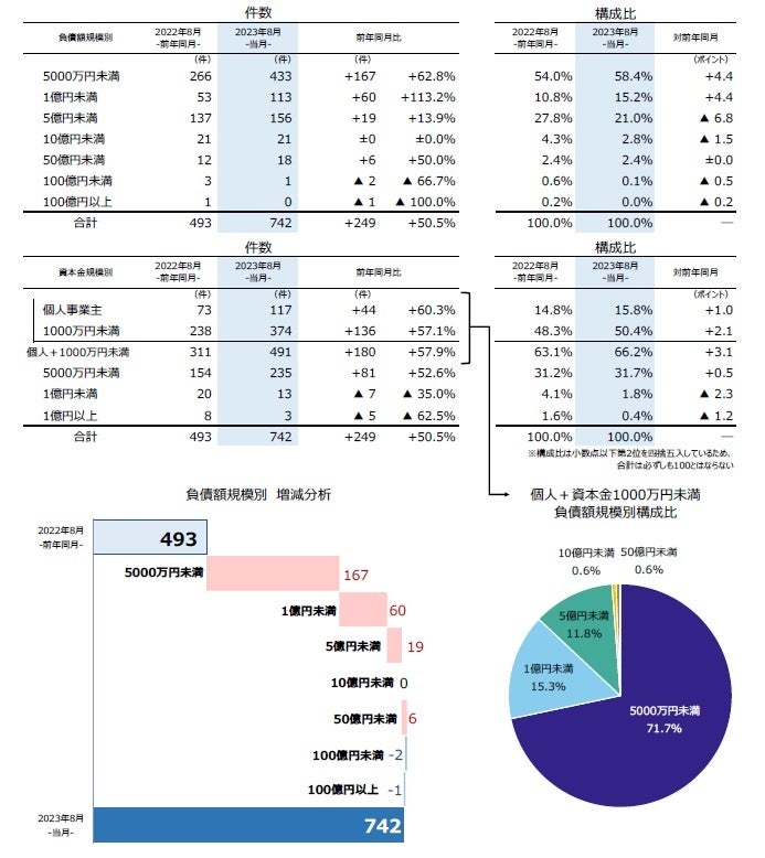 資本金規模別では、『個人+1000万円未満』の倒産が491件(前年同月311件、57.9%増)となり、全体の66.2%を占めた。