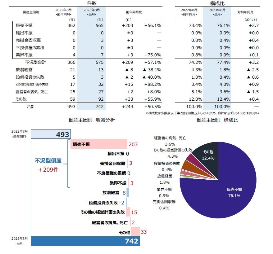 主因別にみると、「販売不振」が565件(前年同月362件、56.1%増)で最多、全体の76.1%(対前年同月2.7ポイント増)を占めた。内訳を業種別にみると、「サービス業」(前年同月93件→132件)が最も多く、「小売業」(同65件→120件)が続いた。「業界不振」(同4件→7件、75.0%増)などを含めた『不況型倒産』の合計は575件(同366件、57.1%増)となり、7カ月連続で前年同月を100件以上上回った。