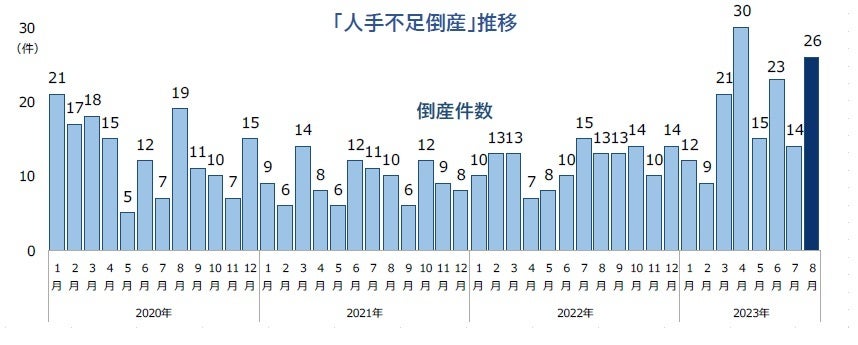 「人手不足倒産」は、2023年8月に26件(前年同月13件、100.0%増)発生し、前年同月から倍増した。2023年1-8月累計は150件となり、8月時点での150件到達は、集計開始して以降初めて。また、従業員や経営幹部などの退職・離職に起因した「従業員退職型」倒産は1-8月で40件に達した。40件台となったのは、過去最多であった2019年以来。