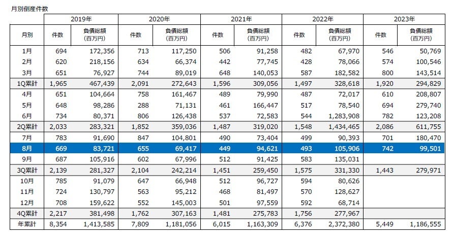 企業倒産は742件、前年同月の1.5倍に 全国10県で2022年通年の件数を超える ― 全国企業倒産集計2023年8月報