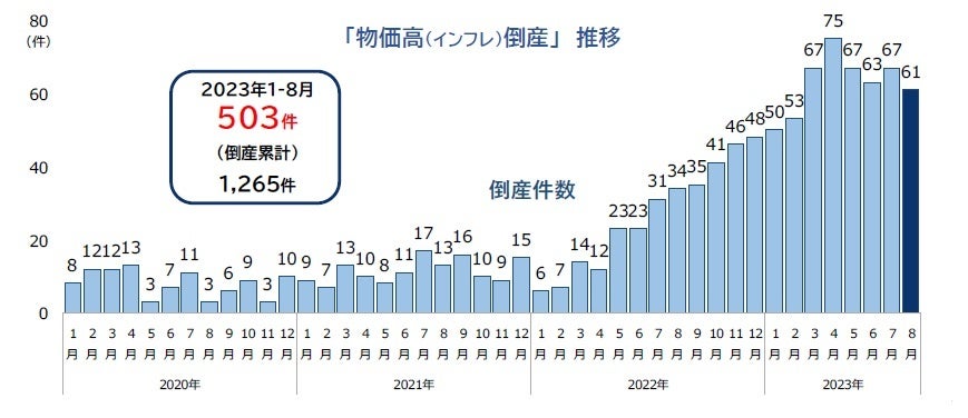 「物価高(インフレ)倒産」は、2023年8月に61件(前年同月34件、79.4%増)発生した。1-8月累計では503件に達し、通年で700件を超えるペースで推移している。要因別では、原材料やエネルギーコストの高騰によるものが多くを占めるものの、人件費高騰や価格転嫁難により倒産に至るケースも目立ってきている。