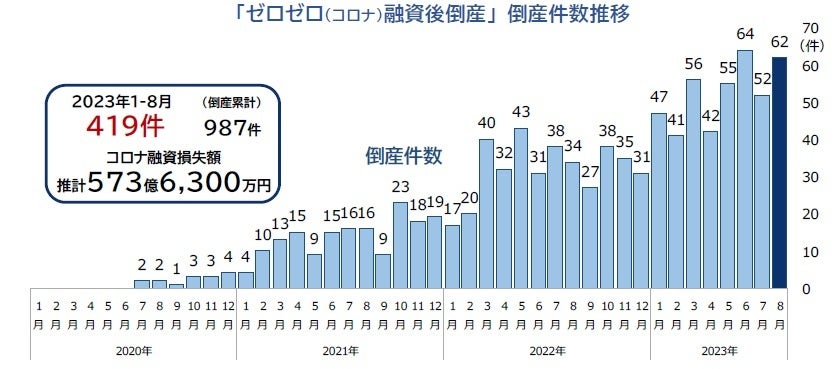 「ゼロゼロ(コロナ)融資後倒産」は、2023年8月に62件(前年同月34件、82.4%増)発生し、過去最多であった2023年6月(64件)以来の高水準となった。2023年1-8月累計では419件となり、2022年通年(386件)をすでに上回った。また、「不良債権(焦げ付き)」に相当するコロナ融資喪失総額は推計で約573億6300万円にのぼった。