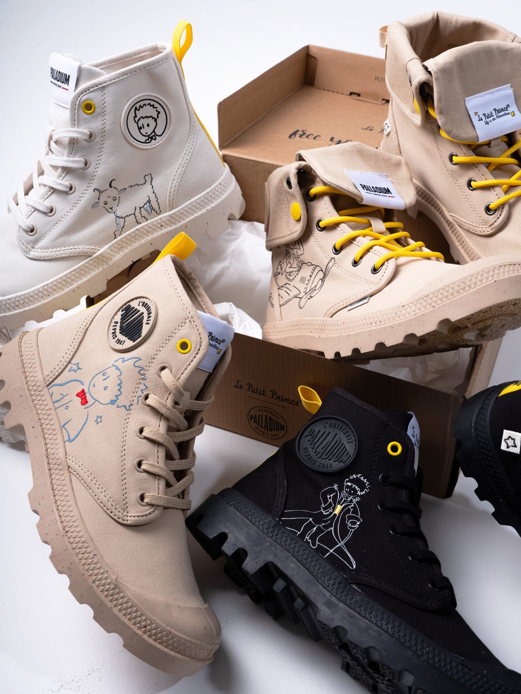 さらに、3月半ばにグローバルローンチをした『星の王子さま』とのコラボブーツで、世界的に注目を浴びています。『星の王子さま』は、時代と世代を超えて、600以上の言語に翻訳されるフランスの文学作品で、共通する伝統や価値である「旅」や「発見」、「探検」を称え、パラディウムの冒険心を融合させたコレクション。王子さまやヒツジのイラストはもちろん、アイテムのかかとには、「deggine-moi un mouton(ヒツジの絵を描いて)」など、原作からの引用をプリントし、物語の世界へと誘う、本好きに刺さる1足です。