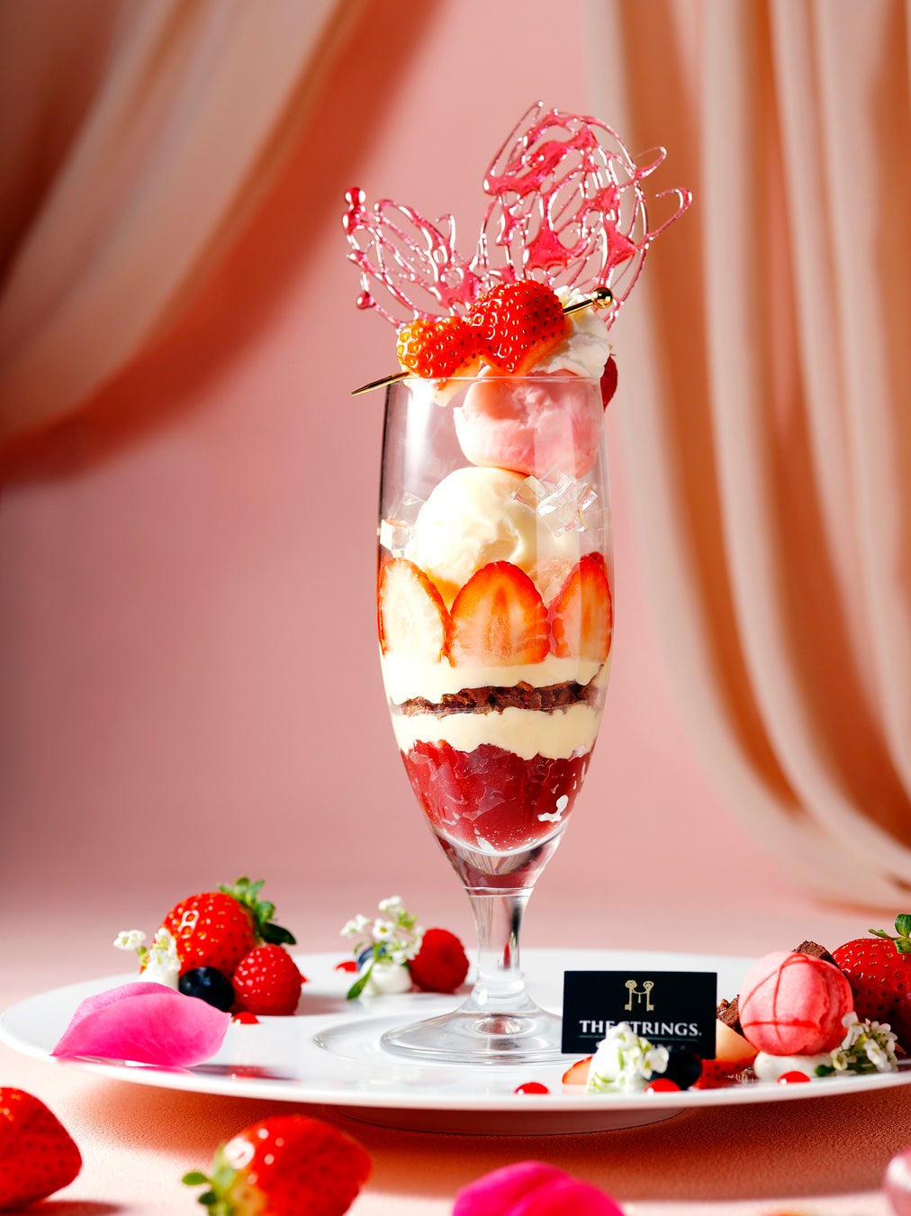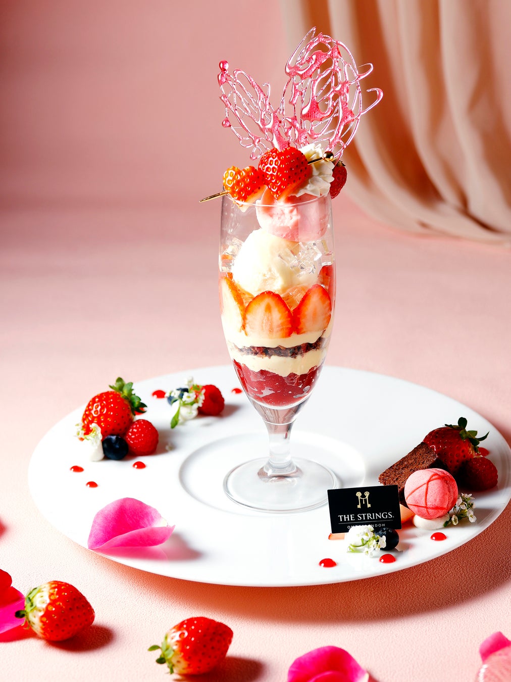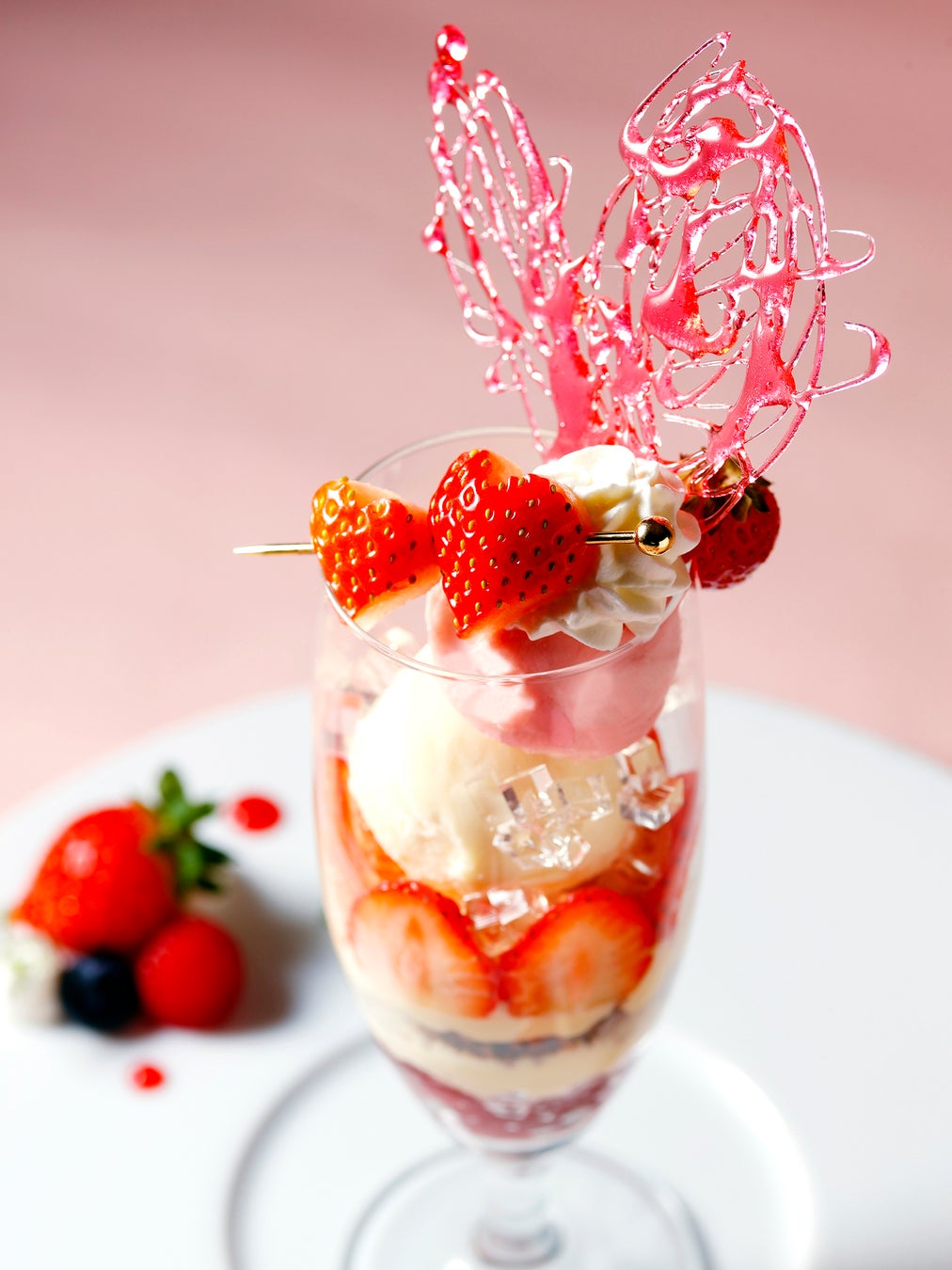 パフェの下層は、いちごとグリオットチェリーを合わせた真っ赤なゼリーとカスタードクリーム、ワッフルクッキーチョコクランチを重ね、ほどよい酸味やザクザクとした食感をお楽しみいただけます。その上にはカットしたいちごを並べ、甘酸っぱさと果実味をプラス。さらにホワイトチョコレートととちおとめの2種のフレーバーのアイスもトッピングしました。アイスの周りには宝石のような白ワインのクリスタルジュレを散りばめ、トップには射抜かれたハート型のいちごとピンクカラーの飴細工を大胆に飾りました。