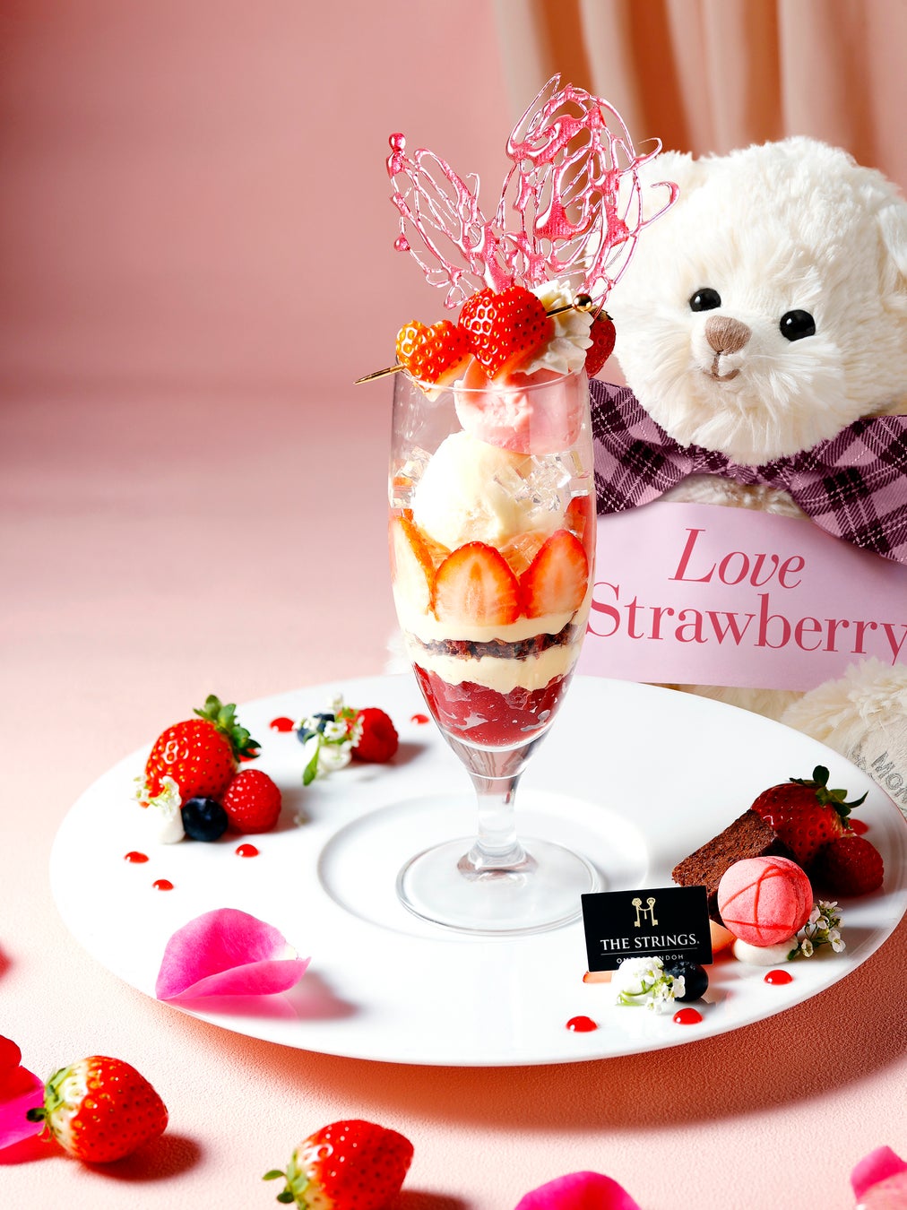 “いちごに恋する”がテーマのパフェは、いちごを主役に、恋心を表現するハートを大胆にあしらったラブリーな装いに。リボンで可愛くおめかししたストリングスベアが一緒にお出迎えいたします。