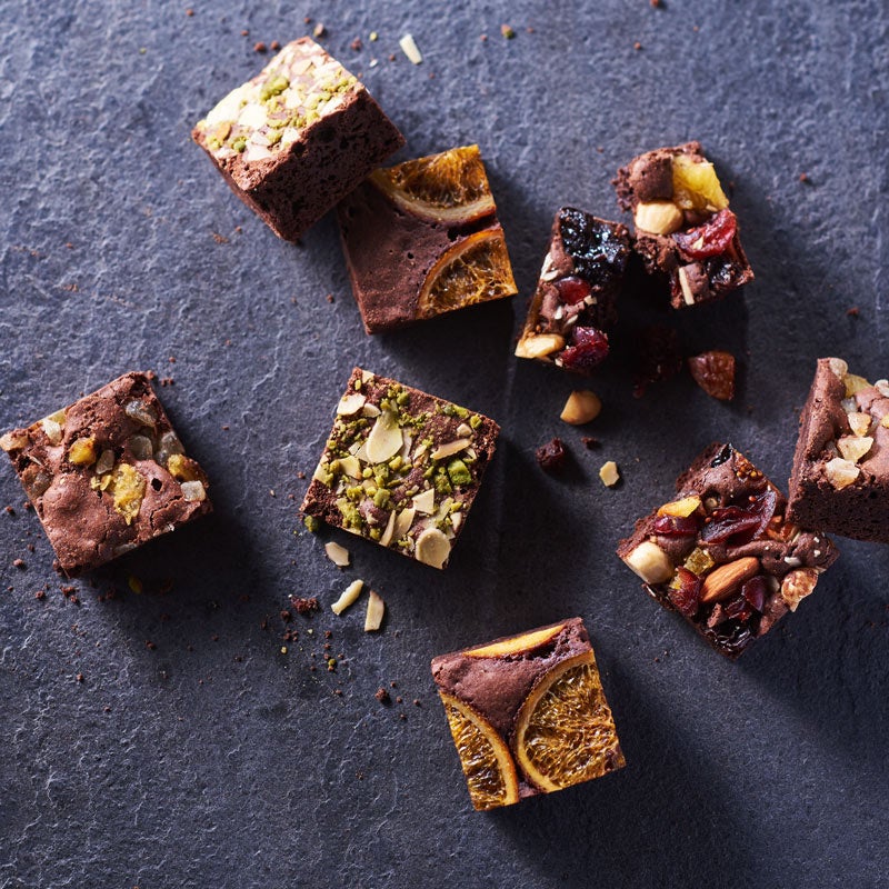 「フルーツの魅力をたくさんの人に届けたい」という思いで、山口県柳井市から全国へフルーツを使用したスイーツをお届けしている「ホシフルーツ」のブラウニー。濃厚なチョコレートの生地に、香ばしいナッツや甘酸っぱいフルーツをトッピングしています。ピスタチオとアーモンド、ごろっとしたパイナップルやネーブル、たっぷりのドライフルーツとナッツが奏でるおいしさをぎゅっと詰め込んだキューブ型のブラウニーが、お口に小さなしあわせをお届けします。