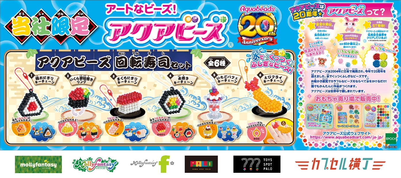 株式会社イオンファンタジー(本社:千葉県千葉市、代表取締役社長:藤原徳也、以下、当社)は、株式会社エポック社の「アクアビーズ」のカプセルトイ「アクアビーズ 回転寿司セット」を、アミューズメント施設「モーリーファンタジー」「PALO」、カプセルトイ専門店「TOYS SPOT PALO」などに設置する当社オリジナル完全キャッシュレスカプセルトイマシン「かぷえぼ」限定で7月12日(金)より順次展開いたします。