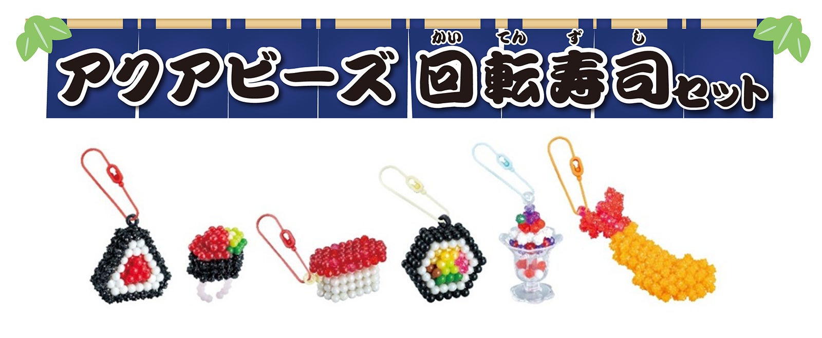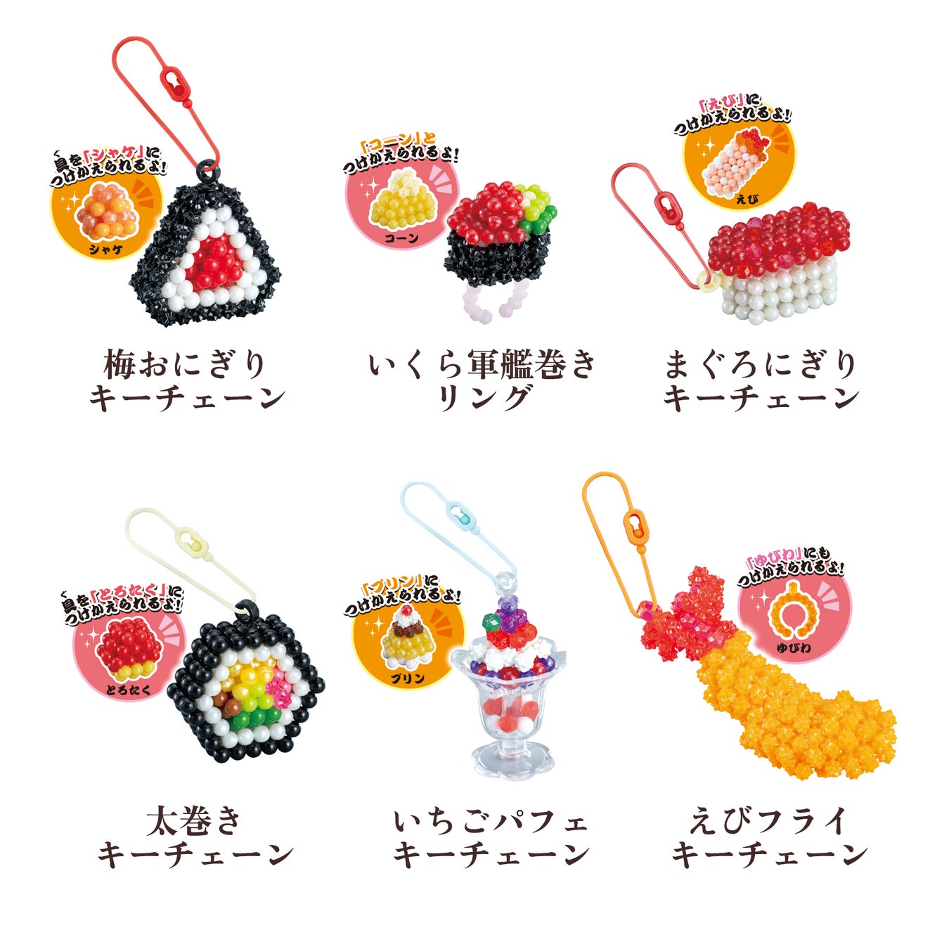 回転寿司の人気メニュー、にぎり・巻き物・軍艦巻きなどをモチーフにした「アクアビーズ」のキーチェーンやリングが作れるセットです。