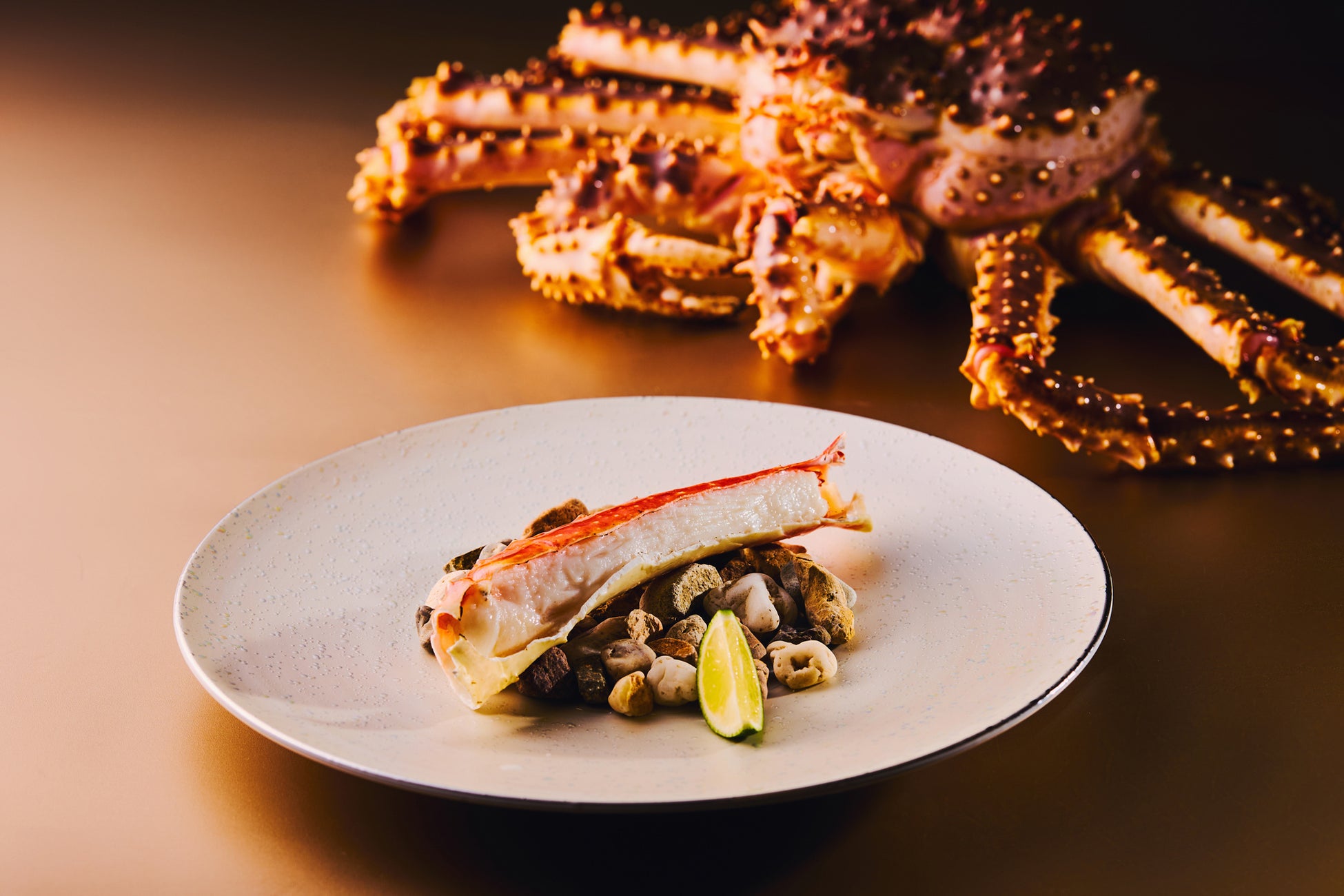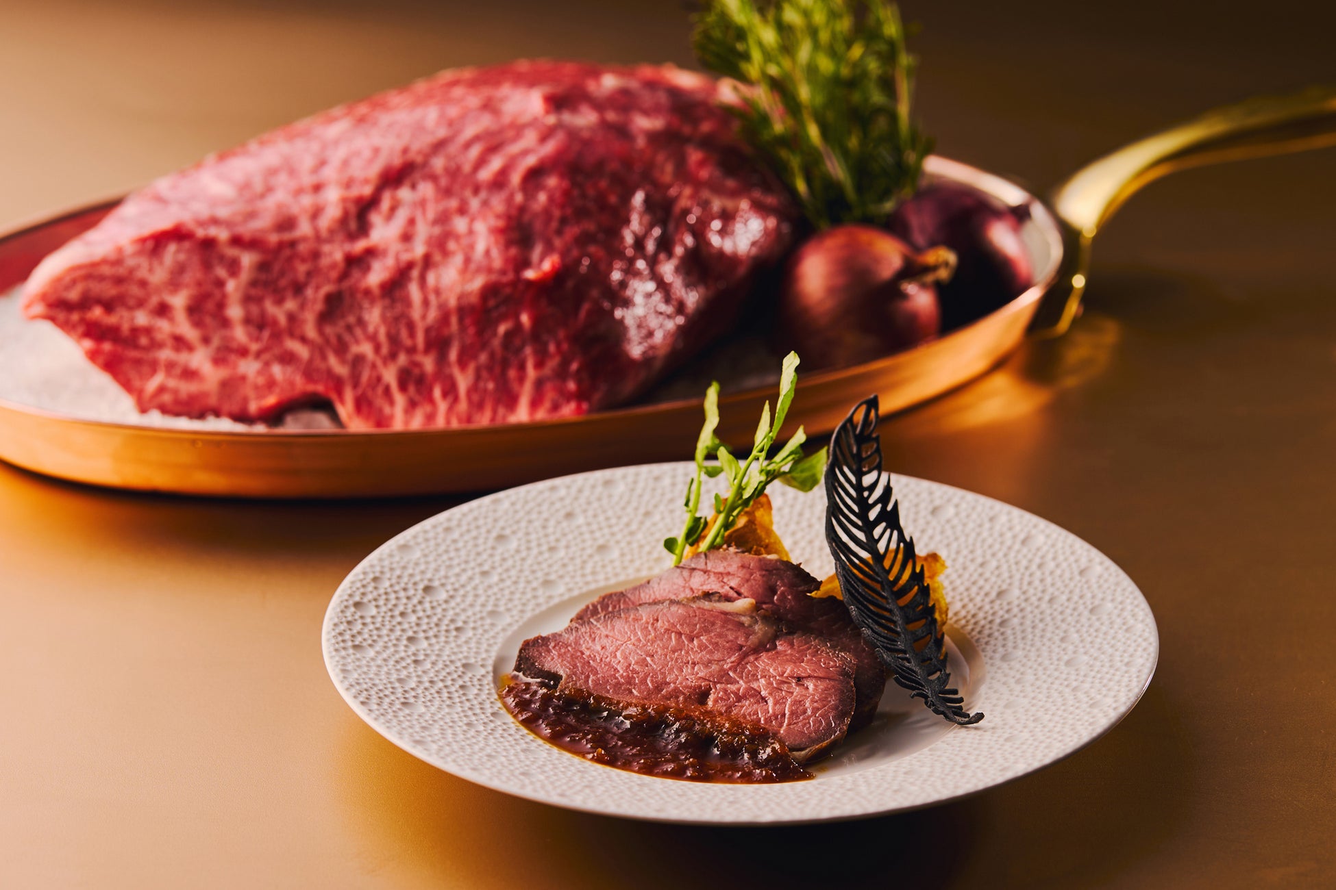 フレンチのフルコースに、大阪発祥の割烹の趣も取り入れ、目の前の鉄板で仕上げて提供する“フレンチ割烹”スタイル。全長約12メートルのロングカウンターや、大阪の景色を一望できるコーナーカウンターが非日常を演出します。メインの松阪牛をはじめ、数の子、毛蟹、鮑など、繁栄や長寿を願う素材が勢ぞろい。ランチでは甘鯛が、ディナーでは伊勢海老が、お祝いムードさらに演出。ヴルーテは紅白の彩に。初春の宴にふさわしい華やかなコースです。