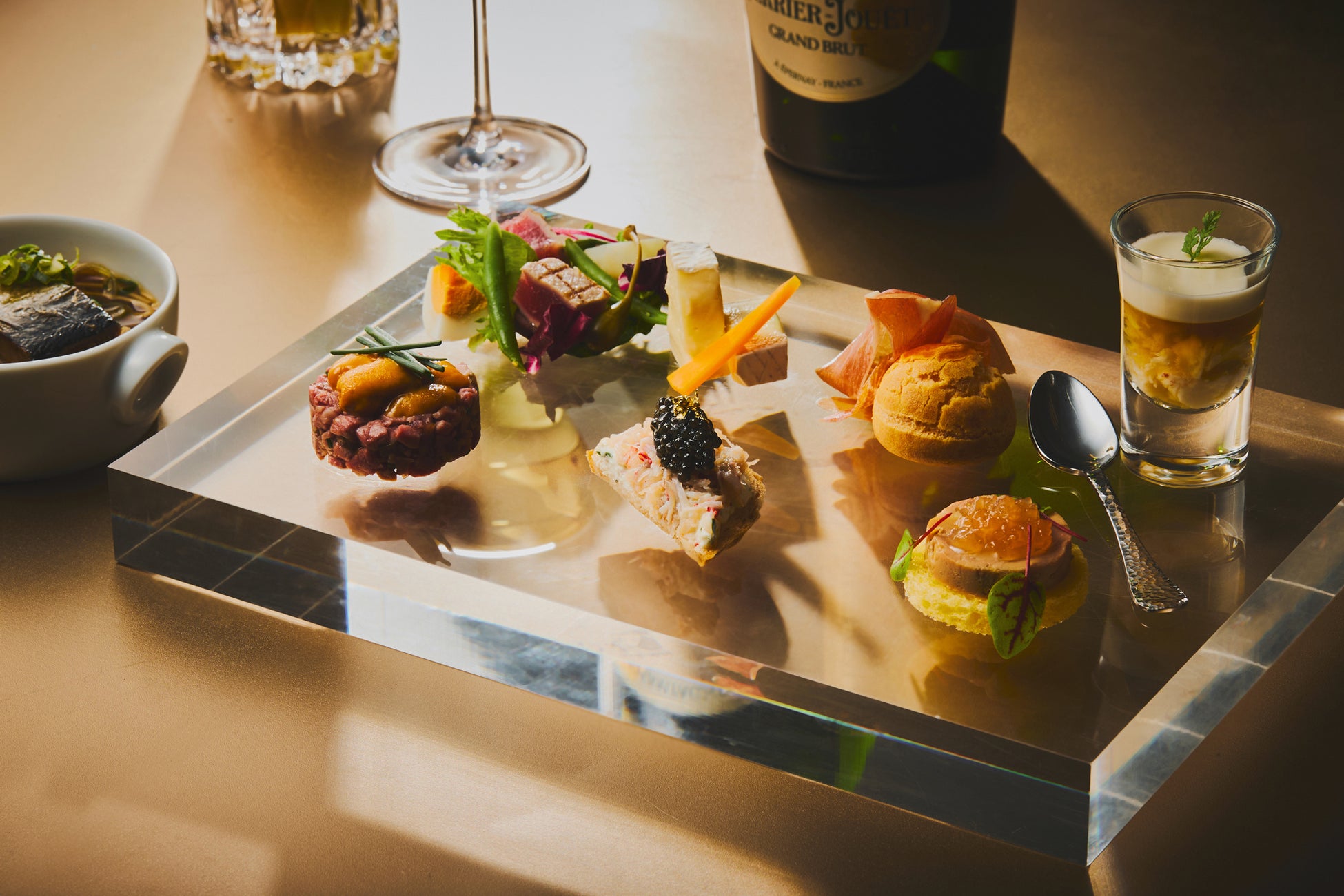 “豪華列車の食堂車”をイメージしたオールデイダイニング。選りすぐりの日本各地の食材と世界の素材を、フレンチと和の技法で調理します。チョイスメニューには「黒毛和牛の炭火焼 焦がし玉ねぎのソース」や「蟹の炭火焼 琴引の塩ポン酢」など、スペシャルメニューが登場。ビュッフェ台にはおせち料理も加わります。デザートでは、フランスで「公現祭」(1月6日)に味わう伝統のケーキ「ガレット・デ・ロワ」にご注目。グルマン(美食家・食いしん坊)を唸らせる創意に満ちたメニューを、和洋の垣根を越えて提案します。