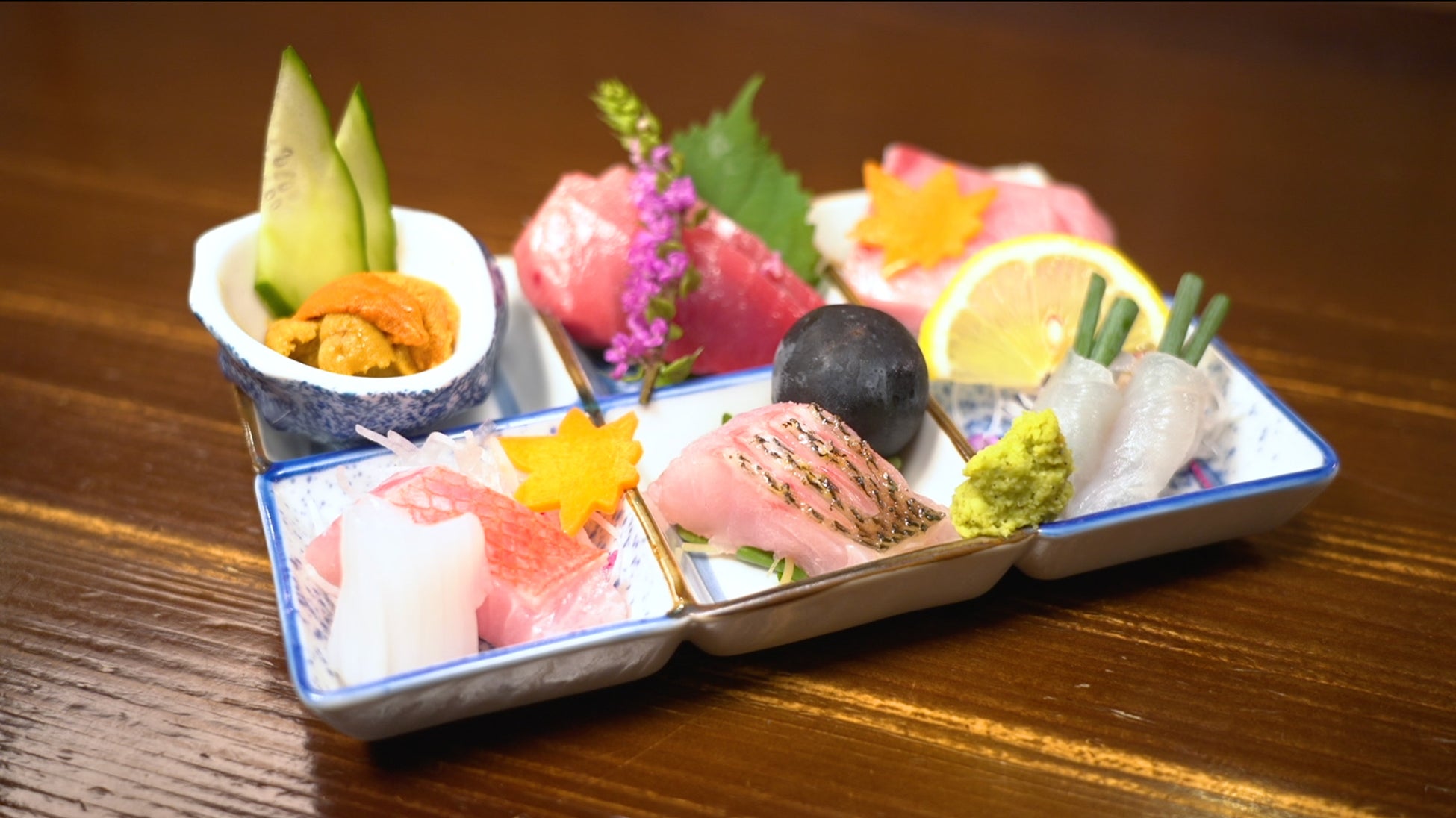 1品目に注文した刺身の盛り合わせは、毎日市場で仕入れたいいネタが日替わりで盛られている。この日のラインナップは天然ブリ・マグロ・生ウニ・アオリイカ・金目鯛・黒ムツ・とらふぐ。「めちゃくちゃ旨い」「良質な味」とマキタも大絶賛だ。