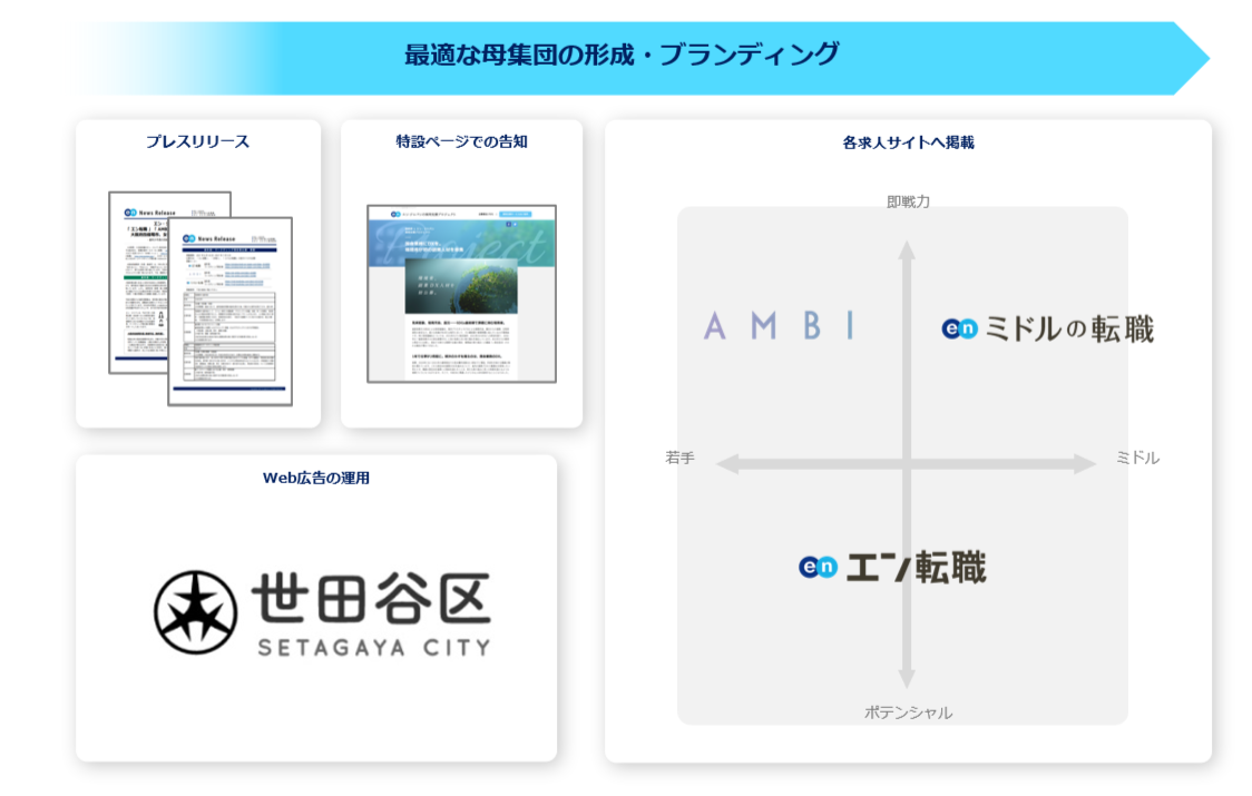 プレスリリースや特設ページ、Web広告での告知に加え、各求人サイトでの集客支援を行ないます。『エン転職』『AMBI』『ミドルの転職』とターゲットの異なる3つの求人サイトを活用することで、ターゲットへ網羅的に求人を届けます。