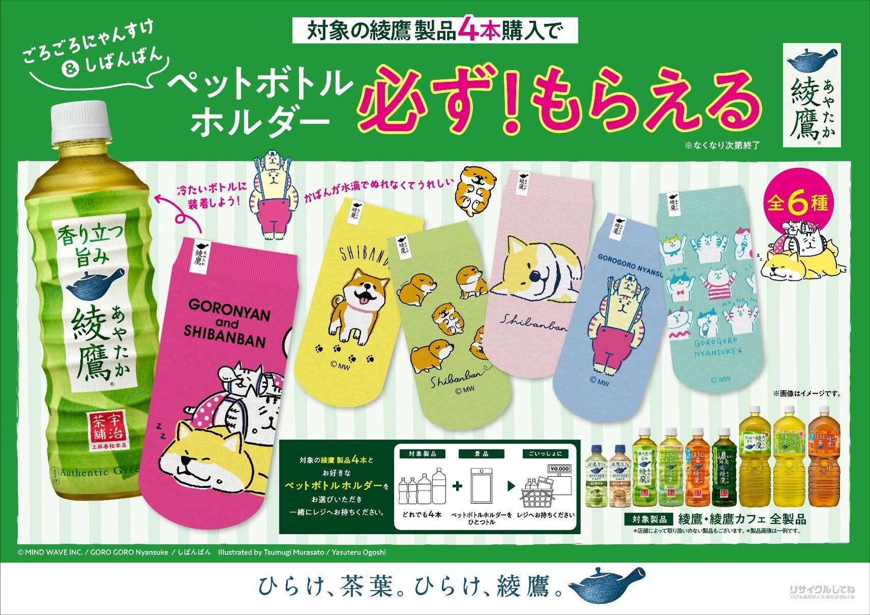 スーパーマーケット、ドラッグストアなど全国のキャンペーン対象店舗で、「綾鷹」・「綾鷹カフェ」全製品のうちから4本を購入頂いた方に、「ごろごろにゃんすけ」「しばんばん」コラボのPETボトルホルダーがもらえます。