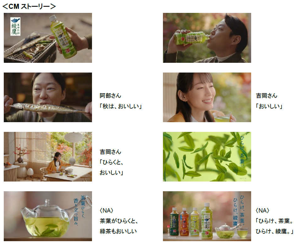 食欲の秋。おいしい食べ物が旬を迎える秋。8月29日(月)からスタートする秋のキャンペーンでは、吉岡さん、阿部さんが初共演する新TVCMにおいて、新コンセプト「茶葉ひらく、香り立つ旨み」を「ひらくとおいしい」秋の食材になぞらえ、綾鷹のおいしさを発信していきます。その他にも、屋外広告や秋の味覚が当たるレシートキャンペーン、店頭でのコラボアイテムの展開などを実施します。