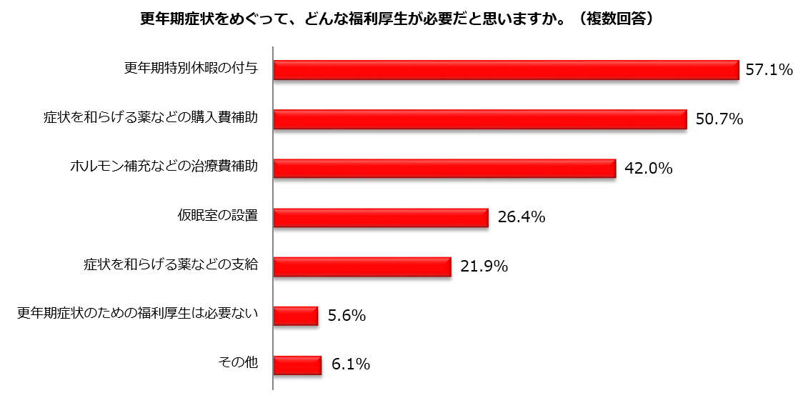 更年期症状が原因で仕事において不利な状況が生じていると感じることが「ある」と答えた人に、「どのようなことで不利な状況が生じていると感じますか」と尋ねたところ、最も多かったのが「体調不良で本来の力が出せない」で75.2%に及びました。さらに、「イライラなど精神が不安定になり周囲と軋轢が生じやすい」や「怠けていたり、やる気がないように誤解を受けやすい」と回答した人も過半数となりました。「更年期症状をめぐって、どんな福利厚生が必要だと思いますか」との質問に対しては「更年期特別休暇の付与」57.1%、「症状を和らげる薬などの購入費補助」50.7%、「ホルモン補充などの治療費補助」42.0%と続きました。
