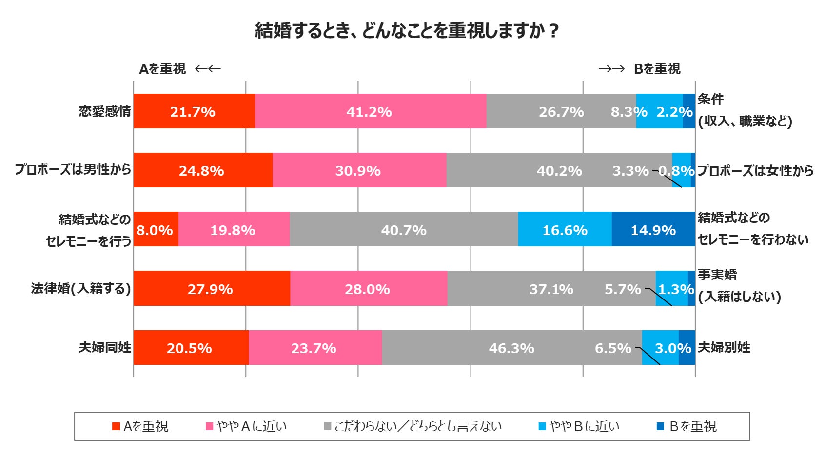 プロポーズについては、「男性からする・してほしい」人が55.7%で半数を占めました。結婚式などのセレモニーは「こだわらない/どちらとも言えない」が40.7%となっていることから、お相手に合わせたいと考えている人が多いのかもしれません。「法律婚(入籍する)」を重視する人は55.9%で、「夫婦同姓」を重視する人は44.2%でした。