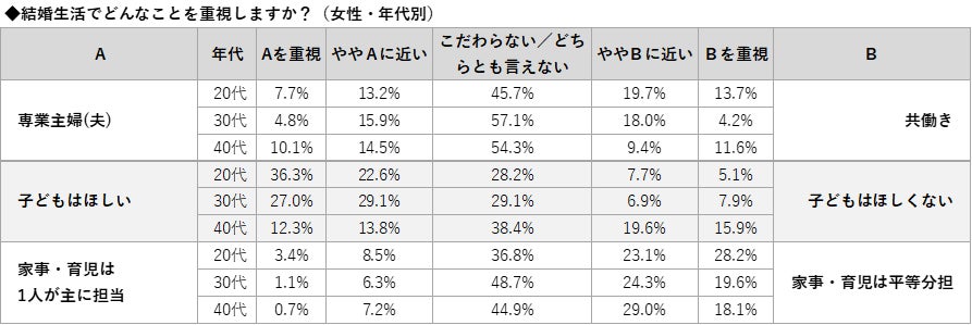 男女×年代別に見ると、「共働き」を重視(20代男性:22.7%、20代女性:33.4%)、「家事・育児は平等分担」を重視(20代男性:31.2%、20代女性:51.3%)となっており、20代は男女で差が開く結果となりました。