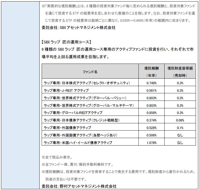 このたびサービス提供開始から2年1ヵ月で残高1,000億円を達成することができたのは、それぞれのコースにおいて、低コスト(投資一任手数料(税込、年率)は、AIラップ:0.66%、匠ラップ: 0.77%、SBIラップ×SBI新生銀行およびSBIラップ×投資信託相談プラザ: 1.21%)で全自動の資産運用を行える点を評価いただいたものと考えています。